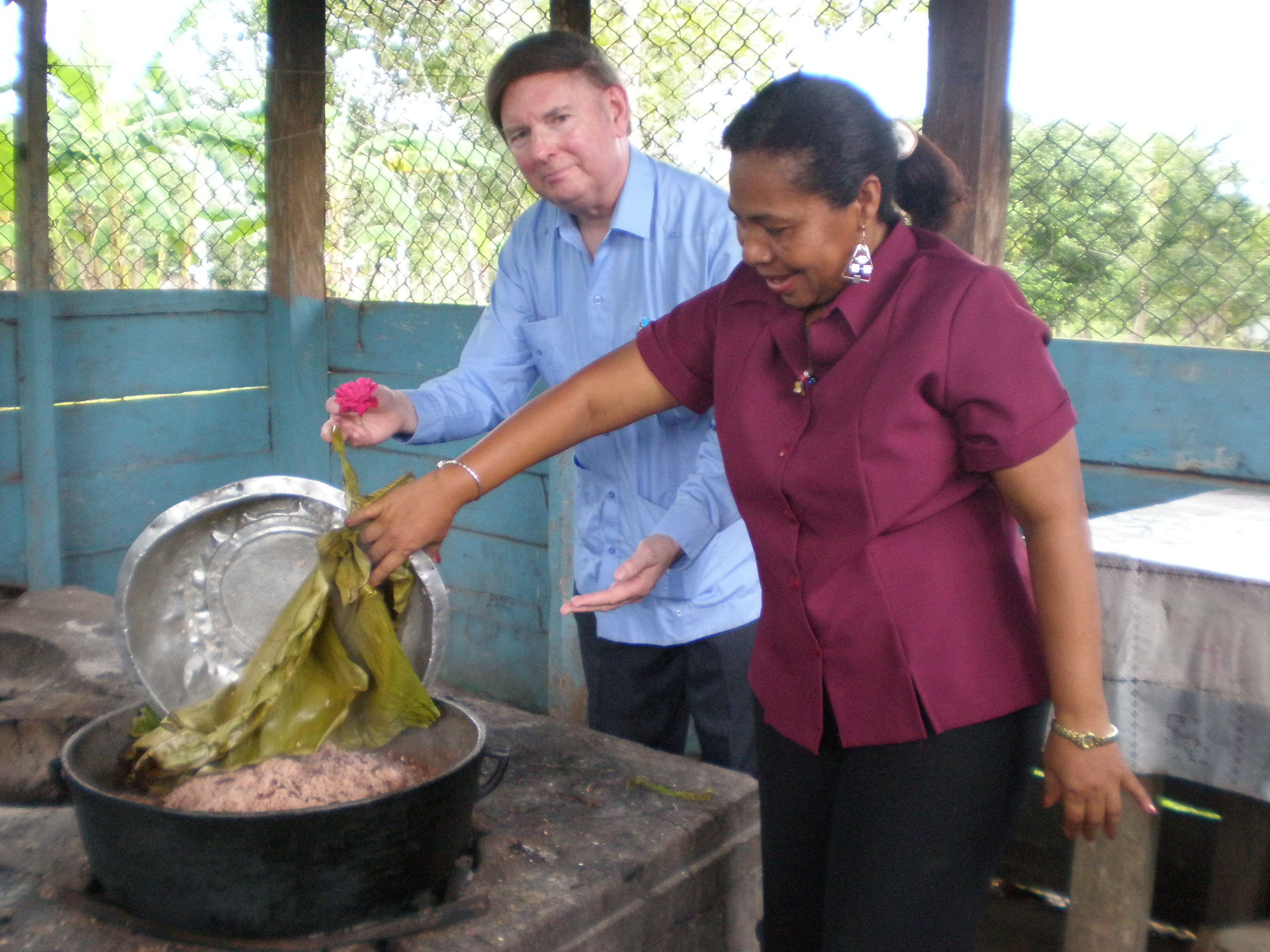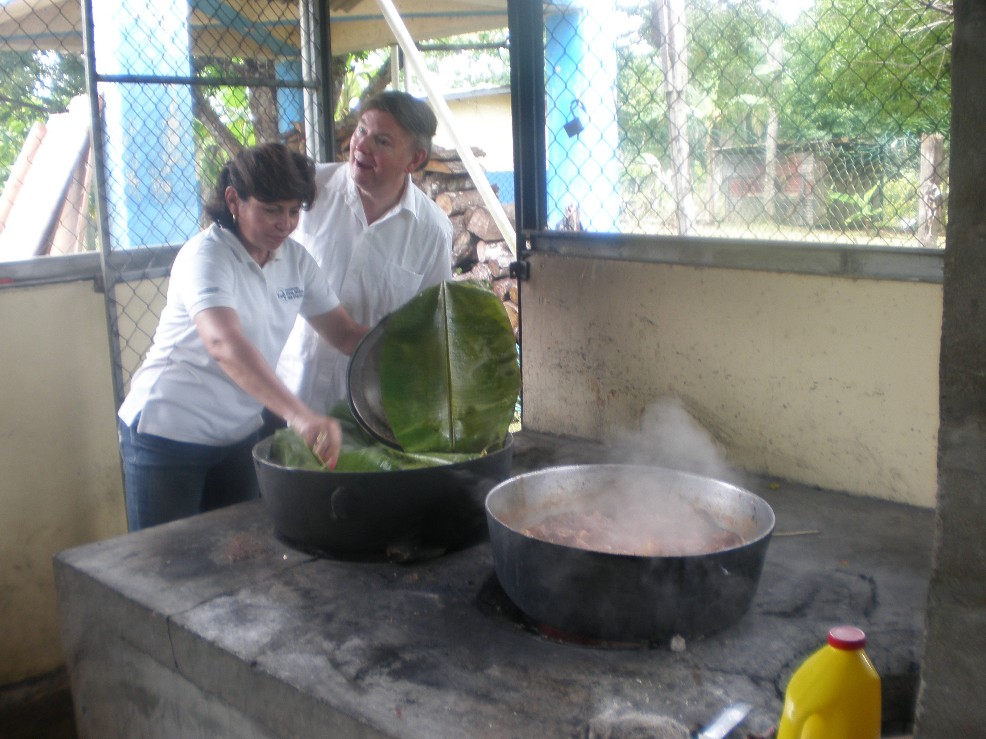 There is an outdoor kitchen, in which mothers volunteer each day to cook for the students. Looking beneath the banana leaf, we find a delicious rice dish with chicken, all cooked over a wood stove. We’ve been invited to have lunch with the kids and their teachers.