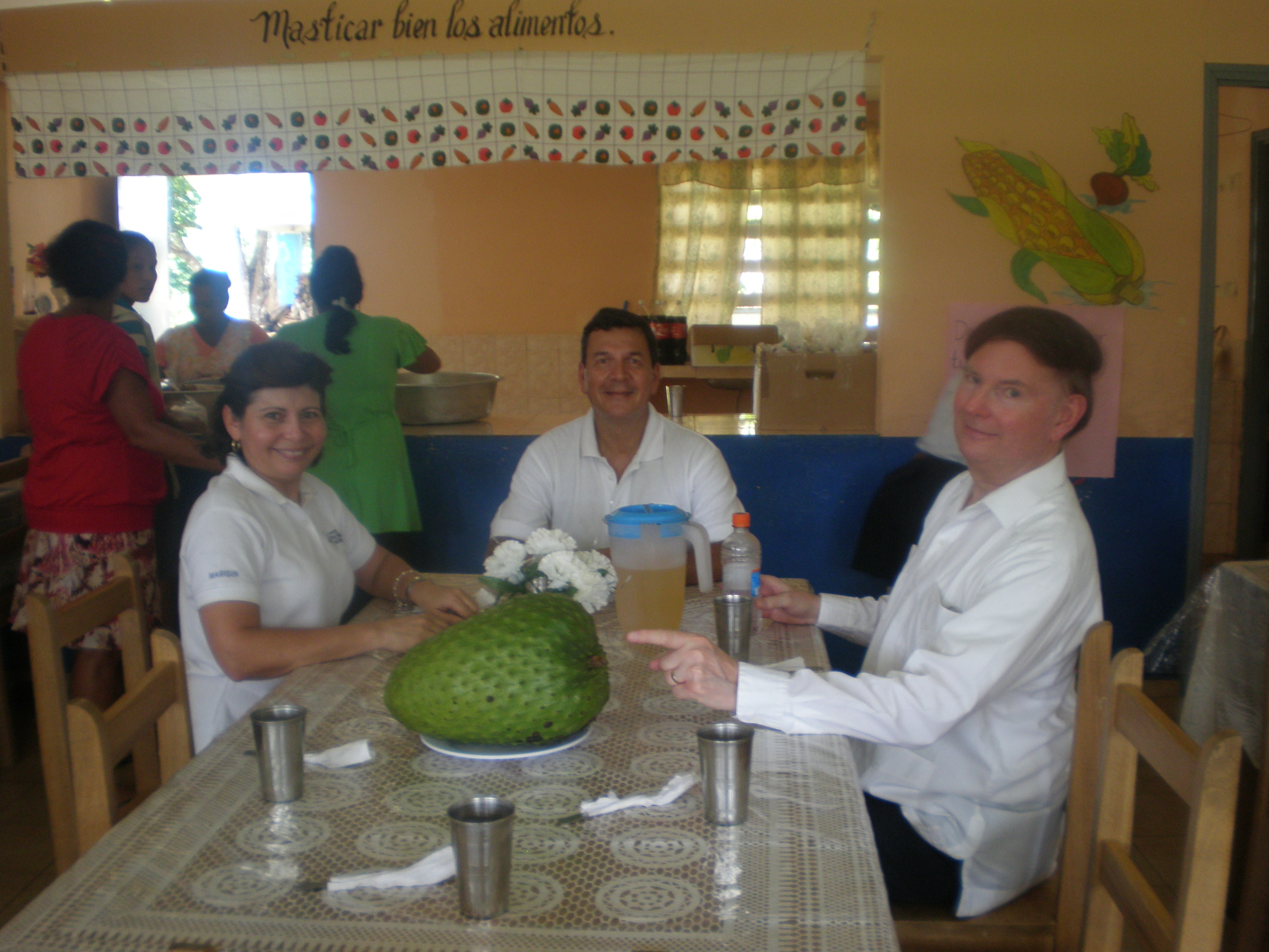 En el huerto de la escuela, hay guanábanas – pero esa fruta no existe en Darién, Connecticut. Es algo muy especial para este padrino del otro lado del puente – y algo que sus estudiantes nunca han probado.